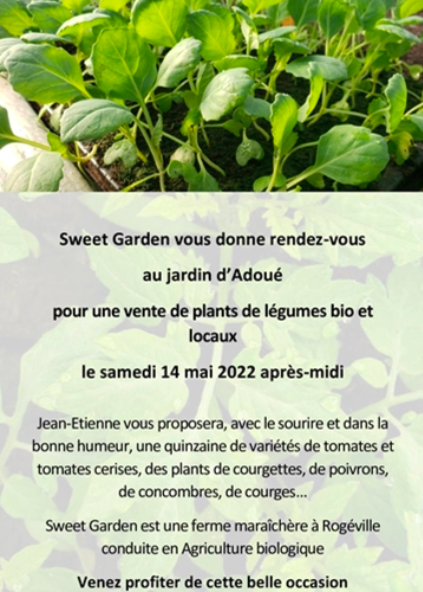 Le samedi 14 mai 2022 après midi, Sweet Garden s’invite au jardin d’Adoué. Ferme maraîchère bio à Rogéville, Sweet Garden proposera à la vente ses produits au jardin d’Adoué le samedi 14…