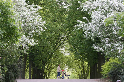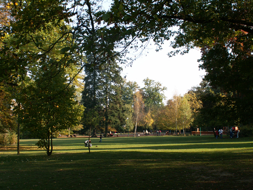 L’allée de pourtour du parc paysager se coule à mi-pente : d’un côté elle offre de belles fenêtres sur la vallée de la Chiers, de l’autre elle est dominée par de vastes pelouses ourlées de grands arbres. Ici et là, une essence rare ou un groupe de résineux vient ponctuer la composition et solliciter le regard. A l’extrémité sud du parc, l’allée s’infléchit parallèlement au méandre de la Chiers ;