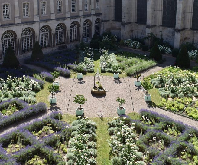 Avant de s’y engager, le promeneur peut faire une station à la Thébaïde, petit jardin planté d’arbustes et de rosiers à floraison blanche, entourant un édicule dans les murs duquel ont été remises à l’honneur des statues de la façade Renaissance détruite.